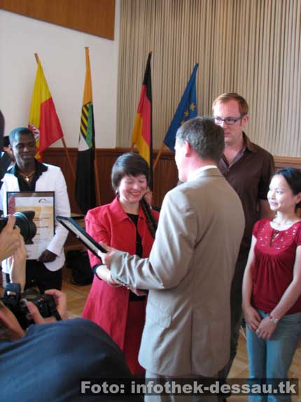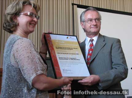 Tatjana Lorenz und ihre MitstreiterInnen vom „Initiativ-Verein für Integration & Zusammenleben“ aus Merseburg stellen ihr Projekt selbstbewusst vor (mehr dazu hier...). „Wir sind nun mal hier und damit müssen sie klarkommen“, sagt die Vereinssprecherin eloquent bei der Preisübergabe. Der Verein wirkt im Landkreis Merseburg-Querfurt unermüdlich für die Integration von Spätaussiedlern, Kontingentflüchtlingen und jüdischen Menschen aus der ehemaligen Sowjetunion. Dass die Protagonisten eine gleichberechtigte Interaktion und keine Assimilation meinen, belegt ein Kurzfilm der im Rathaussaal über die Mattscheibe flimmert. Zusammen mit dem Offenen Kanal Merseburg wurde so ein regelmäßig ausgestrahltes TV-Format produziert, dass eben nicht nur auf die Wurzeln der russischen Kultur eingeht, sondern auch über die Fluchtgründe und die Lebenswirklichkeit nebst der Bewältigung des Alltags der Aussiedler in der Bundesrepublik aufklärt.