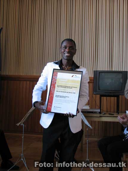 „Wir haben es zusammen geschafft und ich denke, wir können noch viel mehr schaffen“, sagt Mouctar Bah von der Deutsch-Afrikanischen Initiative Dessau nicht ohne Stolz. Stellvertretend nimmt er die Urkunde für das Projekt „african kick“ (mehr dazu hier) in Empfang. Angeregt von der Dessauer Streetworkerin Katrin Fuchs fanden sich im Frühjahr 2005 zahlreiche Akteure, darunter die Netzwerkstelle gegen Rechtsextremismus (Projekt gegenPart), der Landessportbund und die Beratungsstelle für Opfer rechter Gewalt, zusammen, um „ein etwas anderes Fußballturnier“ auf die Beine zu stellen (mehr dazu hier...). „Wir wollten mit dem Fußballturnier keine heile Welt vorgaukeln, sondern vor allem aufrütteln, aufklären und Alternativen aufzeigen“, umriss Marco Steckel von der Beratungsstelle für Opfer rechter Gewalt die Intention der Aktion. Als der „african kick“ in Dessau erstmals geplant wurde, wäre die Stimmung der in der Stadt lebenden Migranten, besonders der afrikanischen Community, auf einem Tiefpunkt gewesen. Der Grund: der Feuertod Oury Jallohs (mehr dazu hier...) und (hier...) und (hier...) am 07. Januar 2005 in einer Polizeizelle. „Damals stand für uns fest: So wie bisher kann es nicht weitergehen“, so Steckel. „Einem demokratischen Rechtsstaat steht es nicht gut zu Gesicht, über Monate ja sogar Jahre hinweg den Feuertod eines Menschen nicht abschleißend mit dem Ziel zu behandeln, Verantwortlichkeiten zu klären„ forderte der Opferberater die längst überfällige juristische Aufarbeitung ein.