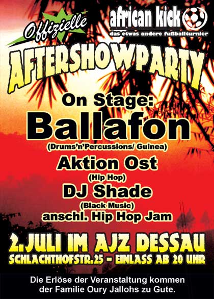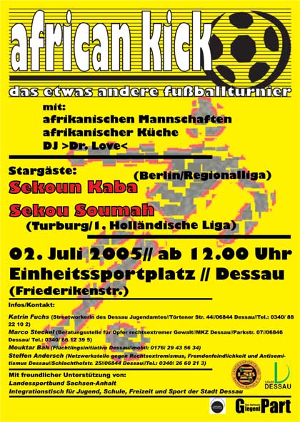 Die Streetworkerin des Dessauer Jugendamtes, die Flüchtlingsinitiative Dessau, die Beratungsstelle für Opfer rechtsextremer Straf- und Gewalttaten und die Netzwerkstelle gegen Rechtsextremismus, Fremdenfeindlichkeit und Antisemitismus veranstalten am 02. Juli 2005 zusammen mit anderen Akteuren ein Fußball-Turnier unter dem Label „african kick“ auf dem Dessauer Einheitssportplatz (Friederikenstr.). Insgesamt haben zwölf Mannschaften, darunter 5 afrikanische Teams, eine Graffiti-Mannschaft und ein Team der Stadtverwaltung Dessau, gemeldet. Als Ehrengäste der Veranstaltung, können dabei Sekou Soumah (Turburg/ 1. Holländische Liga) und Sekoun-Kaba (Berlin/Regionalliga) begrüßt werden.