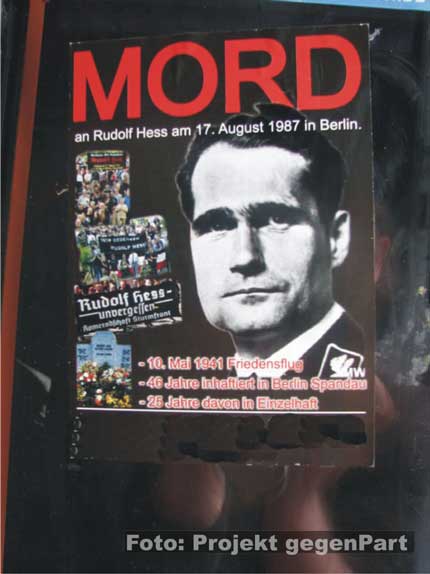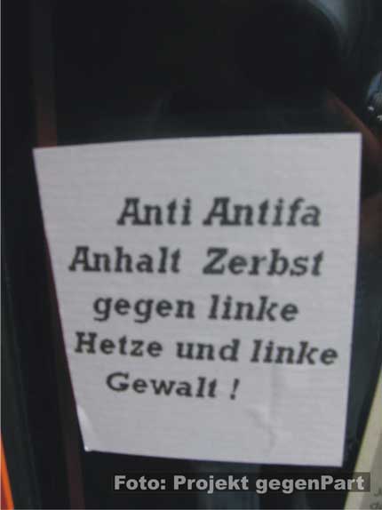 Mitarbeiter des Alternativen Jugendzentrums e. V. (AJZ) stellten an der Eingangstür des Jugendclubs mehrere rechtsextreme Sticks fest. Auf den neonazistischen Aufklebern standen so die Parolen "Kein Islam in Europa", "Anti Antifa Anhalt Zerbst gegen linke Hetze und Gewalt!" und "MORD an Rudolf Hess am 17. August 1987 in Berlin". Als Herausgeber der rechtsextremen Propaganda sind das so genannte "Nationales und Soziales Aktionsbündnis Mitteldeutschland (NSAM)" und das rechtsextreme Shopping-Portal "Wikingerversand" ausgewiesen (mehr dazu hier...), und (hier...) und (hier...) .