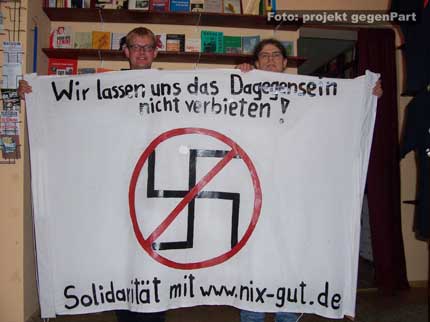 Die beiden Initiativen erstatteten im Oktober 2006 Selbstanzeige wegen der Verwendung von Symbolen verfassungswidriger Organisationen (§ 86aSTGB), weil sie sich im Internet vor einem Transparent zeigten, dass ein durchgestrichenes Hakenkreuz symbolisierte und mit der Aufschrift „Wir lassen uns das Dagegensein nicht verbieten“ versehen war (mehr dazu hier...). Damit wollten sie ihren Protest gegen das skandalöse Hakenkreuz-Urteil des Stuttgarter Landgerichts zum Ausdruck bringen und sich gleichzeitig mit dem Betroffenen solidarisch erklären. Die Kammer in der badenwürttembergischen Landeshauptstadt verurteilte einen Betreiber eines nichtrechten Internethandels damals zu einer Geldstrafe, da er T-Shirt`s und andere Devotionalien mit einem durchgestrichenen Hakenkreuz vertrieb.