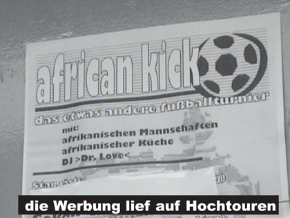Die Streetworkerin des Dessauer Jugendamtes, die Flüchtlingsinitiative Dessau, die Beratungsstelle für Opfer rechtsextremer Straf- und Gewalttaten und die Netzwerkstelle gegen Rechtsextremismus, Fremdenfeindlichkeit und Antisemitismus veranstalteten am 2. Juli 2005 zusammen mit anderen Akteuren ein Fußball-Turnier unter dem Label „african kick“. Von der Resonanz, die dieses Vorhaben hervor rief, waren nicht nur die VeranstalterInnen überrascht. Weit über 100 sportliche Akteure und fast 250 ZuschauerInnen, wollten sich dass Event auf dem Dessauer Einheitssportplatz nicht entgehen lassen. Insgesamt 11 Mannschaften, darunter afrikanische Teams aus Dessau und Berlin, eine Mannschaft der Dessauer Stadtverwaltung, diverse Jugendclubs aus der Muldestadt, ein Team aus der Graffiti-Szene, ein Team vom Verein Roter Stern Halle u. A., traten in zwei Gruppen in einen sportlichen Wettkampf.