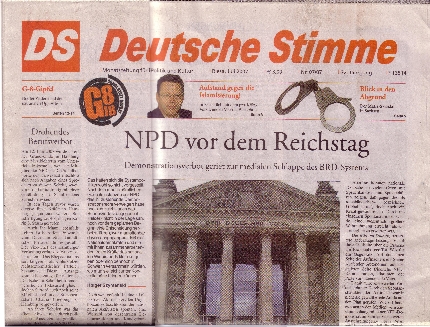 Im Briefkasten des Vereins „Wir mit Euch“ wurde im Verlauf der Woche zum wiederholten Male ein Exemplar einer rechtsextremistischen Zeitschrift eingeworfen. Diesmal handelte es sich um eine Ausgabe der „Deutschen Stimme“, die „Deutsche Stimme“ (DS) ist das Parteiorgan der Nationaldemokratischen Partei Deutschlands (NPD). Die Zeitung wird vom NPD-Bundesvorstand herausgegeben und erscheint monatlich im Deutsche-Stimme-Verlag in Riesa. Die Deutsche Stimme wird vom Bundesamt für Verfassungsschutz beobachtet. Am Haus des Verein „Wir mit Euch“, bei dem u.A. das Koordinierungsbüro des Dessauer Bündnisses gegen Rechtsextremismus ansässig ist, wurden bereits in der Vergangenheit von Unbekannten andere rechtsextreme Publikationen im Briefkasten eingeworfen rechtsextremistische Plakate geklebt (mehr dazu hier...) und verfassungsfeindlichen Symbolen geschmiert (mehr dazu hier...).