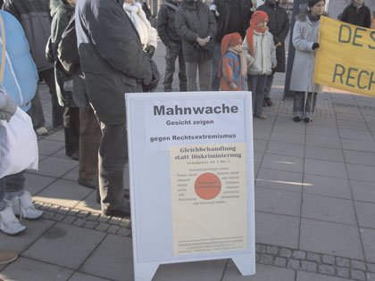 Diese Initiative nehmen Dessauer Akteure zum Anlass, sich an der Aktionswoche zu beteiligen. Am 18. März 2006 veranstaltet das Multikulturelle Zentrum in Zusammenarbeit mit dem Dessauer Bündnis gegen Rechtsextremismus (BgR) unter dem Motto "Zeichen setzen auf vielfältige Weise", eine Kundgebung an der Friedensglocke im Zentrum der Stadt. Im entsprechenden Aufruf der lokalen Veranstalter heißt es dazu: "Die Würde des Menschen ist unantastbar (Art.1 Abs1 1 GG). Dieser Satz wird häufig genutzt, aber selten verstanden. Fremdenfeindlichkeit und Rassismus sind schon lange in der Mitte der Gesellschaft angekommen.". Die Organisatoren rufen alle engagierten BürgerInnen dazu auf, am 18. März zur Friedensglocke zu kommen.