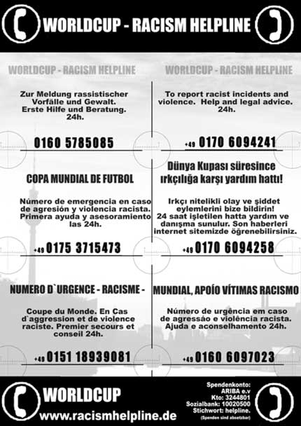Die Beratungsstelle für Opfer rechter Gewalt, die Deutsch-Afrikanische Initiative und die Netzwerkstelle gegen Rechtsextremismus (Projekt gegenPart) beteiligen sich an der Aktion „World Cup Racism Help-Line“.