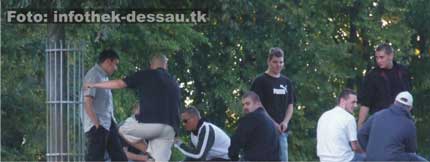 Bergwitz (Landkreis Wittenberg) am 14. September 2006: Die Szenerie ist skurril, beängstigend und verwirrend zugleich. Zwanzig Neonazis und rechtsextreme Jugendliche lungern vor dem Sport- und Gemeindezentrum herum, geben sich betont selbstbewusst und zeigen sich nach Außen ob der starken Polizeipräsenz unbeeindruckt. Während die einschlägig vorbestraften rechten Schläger aus der Gruppe forsch und souverän auftreten und die Besucher fotografieren, übt der Nachwuchs vor der versammelten Zivilgesellschaft das Vermummen. Alle haben das gleiche Problem, ihnen wird mit Verweis auf das Hausrecht der Zutritt zum Thementag "Wie ist eine nachhaltige Bekämpfung des Rechtsextremismus im Landkreis Wittenberg möglich?" verwehrt. Eine durchaus nicht unumstrittene Entscheidung, wie der weitere Verlauf der Veranstaltung zeigen sollte.