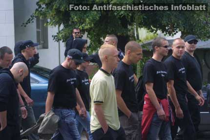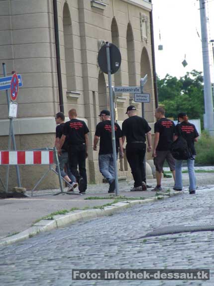In Rathenow (Brandenburg) nahmen ca. 250 Rechtsextremisten und Neonazis an einem von der NPD angemeldeten Aufmarsch teil. Unter den Aufzugsteilnehmern konnten auch Aktivisten der Neonazikameradschaften "Freie Nationalisten Bernburg-Köthen" und "Freie Nationalisten Dessau/Anhalt" festgestellt werden. Der rechtsextreme Personenzusammenschluss aus Dessau, der mit ca. 6 Personen nach Brandenburg gereist war, trat dabei mit einheitlichen T-Shirt`s (siehe Bild oben) in Erscheinung. Auf den Bekleidungsstücken war der Aufdruck "Nur der wahre Zusammenhalt bringt uns zum Sieg! Freie Nationalisten Dessau/Anhalt" zu lesen. Die Dessauer Neonazis bedrohten zudem nach ihrer Rückreise aus Rathenow in der Nähe des Dessauer Hauptbahnhofes einen Mitarbeiter der Netzwerkstelle gegen Rechtsextremismus (Projekt gegenPart).