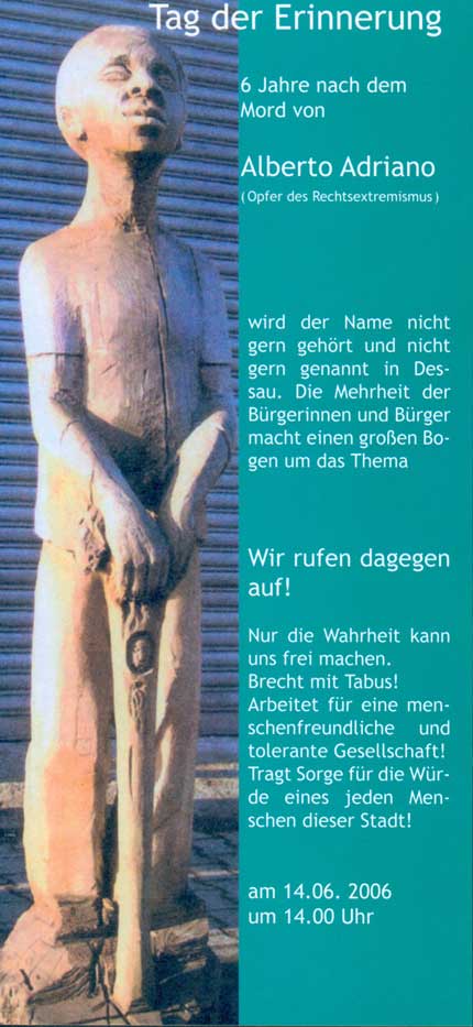 In der Nacht vom 11. zum 12. Juni 2000 war Alberto Adriano im Stadtpark Dessau von Neonazis ermordet worden. Sechs Jahre nach dem Verbrechen wird der Name nicht gern gehört und nicht gern genannt in Dessau. Die Mehrheit der BürgerInnen macht einen großen Bogen um das Thema.