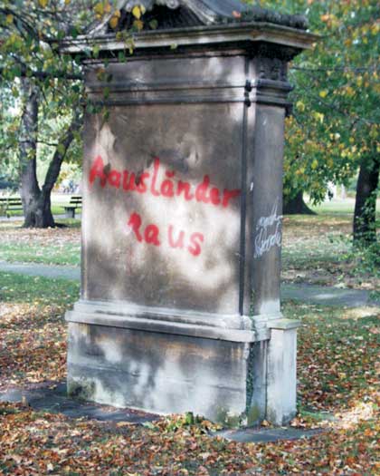 Im Oktober 2004 werden auf dem Historischen Friedhof (Friedhof I) in Dessau mindestens zwei ausländerfeindliche Graffities festgestellt. Auf dem Grabstein des Dessauer Fabrikanten und ehemaligen Generaldirektors der "Continental-Gas-Gesellschaft (Conti) Oechelhauser, sprühen die Täter "Ausländer raus". Das Dessauer Amtsblatt berichtet in der Novemberausgabe über den Vorfall. Das Foto wurde der Chronikredaktion freundlicherweise von der Pressestelle der Stadt Dessau zur Verfügung gestellt.