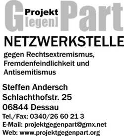 Das Netzwerk Zivilgesellschaft Anhalt, ein Zusammenschluss von zivilgesellschaftlichen Bündnisses aus Köthen, Dessau und Zerbst unter der Schirmherrschaft Sachsen-Anhalts Sozialministerin Dr. Gerlinde Kuppe, wird in den nächsten Tagen mit dem Wahlaufruf „Keine Stimme der NPD und anderen rechtsextremen Parteien“ an die Öffentlichkeit treten (mehr dazu hier...). Den Aufruf haben bereits zahlreiche Persönlichkeiten der Region unterzeichnet.