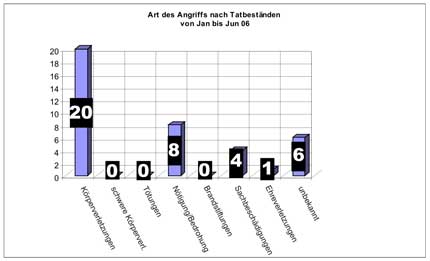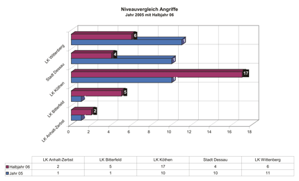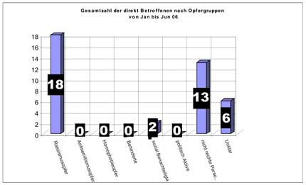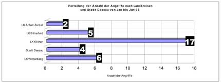 Von Januar bis Juni 2006 sind der Dessauer Beratungsstelle für Opfer rechtsextremer Gewalt- und Straftaten 34 Angriffe mit einem rechten Hintergrund bekannt geworden.