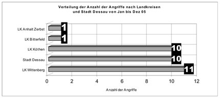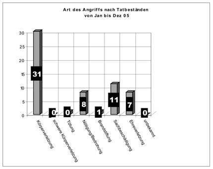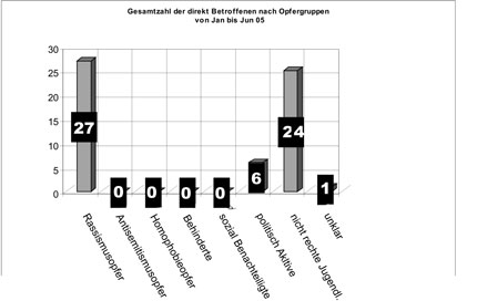 Von Januar bis Dezember 2005 sind der Beratungsstelle für Opfer rechtsextremer Gewalt- und Straftaten 33 Angriffe mit einem rechten Hintergrund bekannt geworden.