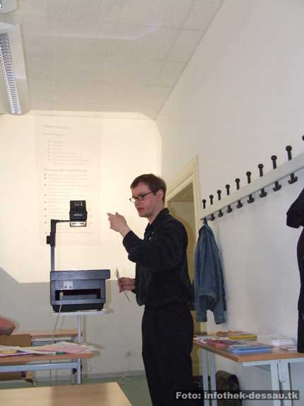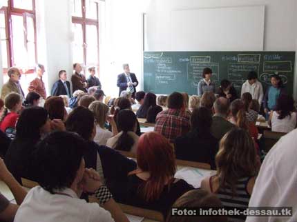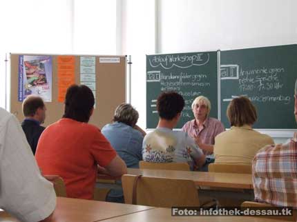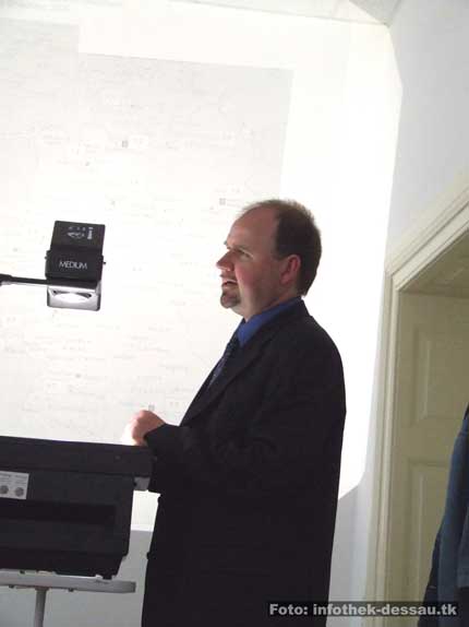 Der Vizepräsident der Hochschule Anhalt, Prof. Rudolf Lückmann, komplettierte die Eröffnungsworte. „Nicht die Glatzen sind das Problem, sondern der intellektuelle Flügel“, warnte er vor dem Erstarken rechtsextremer Einstellungen und Ideologien im akademischen Bereich. Zu den Aktivitäten der so genannten „Neuen Rechten“, zum Beispiel im Umfeld der Zeitschrift „Junge Freiheit“, sah Lückmann historische Parallelen: „Auch viele NS-Verbrecher hatten einen Doktortitel.“ Der Wissenschaftler sah im Sozialdarwinismus, also der Übertragung der Abstammungslehre auf die Sozialisation von Menschen, eine Hauptquelle von Fremdenfeindlichkeit und Rassismus. Dabei bestehe überhaupt kein Zweifel daran, dass „wir biologisch alle eine Art“ sind, so Lückmann weiter. In der Fachhochschule Anhalt gäbe es einige Projekte, die unter der Prämisse „Hilfe zur Selbsthilfe“ liefen. So würden deutsche StudentInnen ausländischen KommilitonInnen bei der Bewältigung ganz praktischer Fragen zur Seite stehen. Im Zusammenhang mit dem Wahlkampf der rechtsextremen DVU zur diesjährigen Landtagswahl berichtete er, dass vor dem FH-Standort in Dessau oftmals Plakate entfernt worden seien: „Da habe ich mich über jeden Rechtsbruch gefreut“.