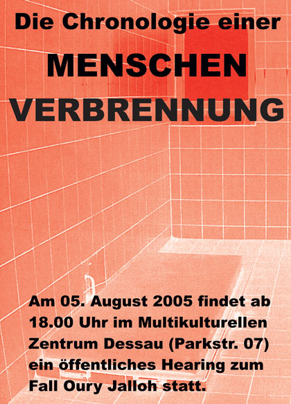 Nicht nur die Veranstalter um die Beratungsstelle für Opfer rechtsextremer Gewalt Dessau, dem Flüchtlingsrat Sachsen-Anhalt und der Netzwerkstelle gegen Rechtsextremismus, Fremdenfeindlichkeit und Antisemitismus waren über den großen Zuspruch, den dass öffentliche Hearing „Chronologie einer Menschenverbrennung“ zum Fall Oury Jalloh am 05. August 2005 fand, positiv überrascht. Oury Jalloh verbrannte am 07. Januar 2005 in einer Zelle des Dessauer Polizeireviers. Unter den 100 Interessierten waren sehr viele Leute aus der afrikanischen Community Dessaus und der Umgebung. Darüber hinaus konnte der Moderator Marco Steckel (Opferberatung) u. a. Bernward Rothe, den innenpolitischen Sprecher der SPD-Landtagsfraktion, Petra Sitte, Landtagsabgeordnete und die sachsen-anhaltinische Spitzenkandidatin der Linkspartei/PDS zur Bundestagswahl und den Ausländerbeauftragen des Landes, Achim Büring, begrüßen.