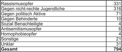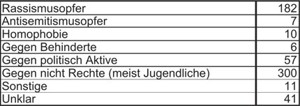Die Beratungsstellen betreuten im vergangenen Jahr insgesamt 1020 KlientInnen, darunter 794 Personen, die direkt zu Opfern rechtsextremer Gewalttaten geworden waren. Es handelte sich dabei um 675 Männer und 118 Frauen. Mindestens 331 der beratenen Personen, vor allem Flüchtlinge, MigrantInnen und AussiedlerInnen, wurden aus einer rassistischen Tatmotivation angegriffen. Ein weiterer Schwerpunkt lag bei 316 meist jugendlichen Opfern, die sich mehrheitlich einem alternativen Milieu zugehörig fühlen. In 70 Prozent der Fälle erwies sich ein langfristiges Beratungsverhältnis als notwendig.