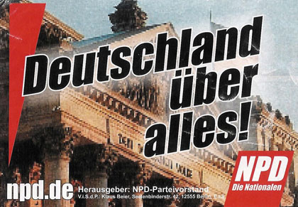 In den Dessauer Stadtteilen Süd, Innerstädtisch Mitte, Nord und Haideburg können mehrere Dutzend NPD-Sticks mit der Aufschrift "Deutschland über alles" festgestellt werden. Engagierten BürgerInnen gelingt es schnell, die Aufkleber zu entfernen.