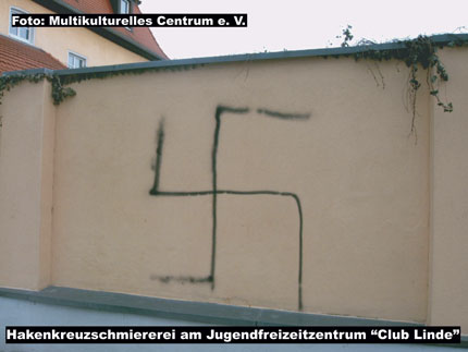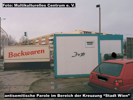 Anfang des Monats kam es in der Stadt zu einer ganzen Serie von fremdenfeindlich und antisemitisch motivierten Sachbeschädigungen (mehr dazu auch hier...). Im Bereich der Kreuzung "Stadt Wien" (ehemaliges Hotel) besprühten vermeintliche Neonazis ein Gebäude mit dem Wort "Ihr" und daran anschließend eine Applikation, die vermutlich einen Davidstern symbolisieren soll. Dabei liegt es nahe, dass die Täter damit die Parole "Ihr Juden" gemeint haben könnten. An der Außenbegrenzungsmauer eines Jugendclubs stellten engagierte BürgerInnen im selben Zeitraum eine Hakenkreuzschmiererei fest. Darüber hinaus tauchten auch im Industriegebiet "Chemiepark" rechtsextreme Sprüche auf.