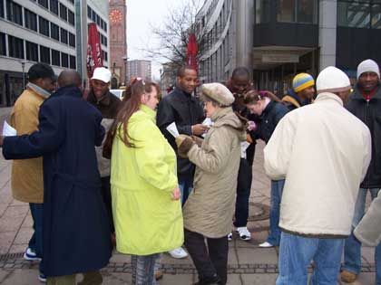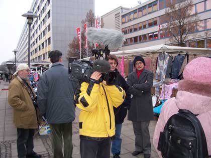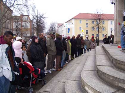 Die eisige Kälte passte irgendwie zum Anlass der Aktion. Die 60 Menschen die sich heute an der Dessauer Friedensglocke versammelten, um an den Tod des Asylbewerbers Oury Jalloh vor genau einem Jahr in einer Dessauer Polizeizelle zu erinnern, kannten sich fast alle persönlich. Neben zahlreichen Flüchtlingen aus der afrikanischen Community der Stadt, waren es vor allem AkteurInnen aus zivilgesellschaftlichen Initiativen, dass Dessauer Bündnis gegen Rechtsextremismus und - das Multikulturelle Zentrum hatten die Veranstaltung maßgeblich organisiert - und einige alternative Jugendliche, die „Aufklärung, Entschädigung und Gerechtigkeit“ forderten. VertreterInnen der Stadt Dessau suchte man dagegen vergeblich und von der örtlichen Kommunalpolitik verschlug es gerade einmal einen Abgeordnete der Linkspartei.PDS zur Mahnwache.