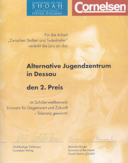 Alternatives Jugendzentrum e.V. Dessau gewinnt 2.Preis im Schülerwettbewerb „Erinnern für Gegenwart und Zukunft – Toleranz gewinnt!“