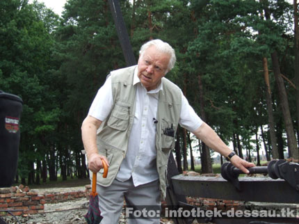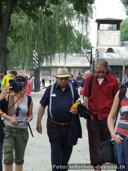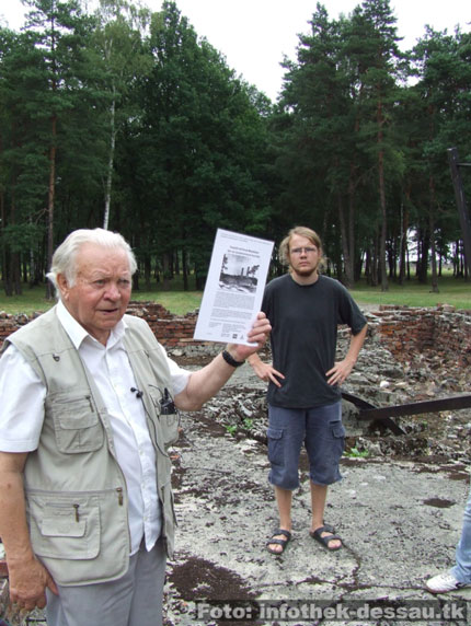 Die Szenerie ist irreal und eigentlich nicht zu begreifen. Henryk Mandelbaum (Jahrgang 1922) läuft über die Ruinen der Gaskammern von Auschwitz-Birkenau und beschreibt den Teilnehmern der Bildungsfahrt im Detail seinen ehemaligen Arbeitsplatz. Der polnische Jude war im Vernichtungslager dem so genannten „Sonderkommando“ zugeteilt. Diese Häftlinge waren unmittelbare Zeugen des deutschen Massenmordes. Sie mussten die Opfer auf ihrem Weg in die Gaskammern begleiten, sie beruhigen. Später, nach dem Tod durch das in Dessau produzierte Giftgas Zyklon B, waren sie für die materielle Verwertung und Entsorgung der Leichen zuständig. Die durchschnittliche Lebensdauer eines Häftlings im Sonderkommando betrug nur wenige Wochen. Dann wurden sie als Zeugen des singulären Menschheitsverbrechens von der SS ermordet. Als Mensch der über die ökonomische Rationalität und das technische Funktionieren der deutschen Todesfabrik Birkenau Auskunft geben kann, ist er nicht nur für die zahlreichen Gruppen, die er trotz seines hohen Alters immer noch begleitet, unverzichtbar, sondern auch ein authentischer Partner der historischen Forschung.