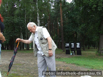 Auf  Franz Rosenbach, einem überlebenden Sinto, der 1945 in der Nähe Dessaus vor der SS flüchten konnte und einige Zeit in Sollnitz verbrachte, freuten sich schon einige Teilnehmer. Seit das AJZ im September 2005 die Ausstellung „Der nationalsozialistische Völkermord an den Sinti und Roma“ in Dessau präsentierte, ist eine enge Freundschaft mit Franz gewachsen. Auch er stand der Gruppe für ein Zeitzeugengespräch zur Verfügung (mehr dazu hier...).