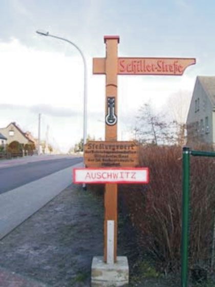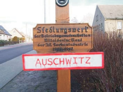 Einen ergänzenden Hinweis, wenn auch nur temporär, konnten interessierte Beobachter nun Anfang Februar ausmachen. Eine Ergänzungstafel mit der Aufschrift "Auschwitz", zierte das Areal in der sachsen-anhaltinischen Gemeinde. In einem "kleinen Aufklärungsblatt" begründeten die AntifaschistInnen ihr Vorgehen: "1926 begann in Leuna die Herstellung von synthetischem Benzin, dessen Kosten zu hoch waren - ohne Hilfe des Staates war die Benzinsynthese nicht überlebensfähig. Aus diesem Grund wandte sich 1932 der Direktor der Leuna-Werke Bütefisch an Adolf Hitler, um herauszufinden, ob das zu teure synthetische Benzin der IG weiterhin durch Schutzzölle subventioniert würde. Darauf folgte im Rahmen des Hitlerwahlkampfes eine Spende in Höhe von 400.000 Reichsmark. Am 14. September 1933 wurde zwischen der IG Farben und Hitler ein Vertrag unterzeichnet, der der IG die Alleinrechte zur Benzinversorgung der Wehrmacht sicherte. Bis 1937 waren nahezu alle Direktoren Mitglied der NSDAP. Die Aufsichtsratmitglieder der IG nannten sich im internen Kreis „Der Rat der Götter“. Wichtige Produkte der IG während des 2. Weltkrieges waren die Stickstofferzeugnisse zur Herstellung von Munition, „Buna“ - synthetisches Gummi als Kautschukersatz, synthetisches Benzin, der Kunststoff Perlon und das Nervengas Tabun. Von den 43 Hauptprodukten der IG waren 28 Produkte für die Wehrmacht. Die IG übernahm eine Reihe von Chemiewerken in besetzten Gebieten, wie die in jüdischem Besitz befindlichen österreichischen Skoda-Werke Wetzler. Durch den - durch den Krieg hervorgerufen - Arbeitskräftemangel forderte die IG immer lauter ZwangsarbeiterInnen. Und so beschloss man im Juni 1942 dieses Problem durch Errichtung eigener KZ zu lösen. Das Konzentrationslager Monowitz, Auschwitz 3, wurde gebaut und nach wenigen Monaten fertiggestellt. „Vernichtung durch Arbeit“ wurde für die IG zum Leitsatz. IG Auschwitz kostete über 30.000 Häftlingen das Leben. Auch im benachbarten Konzentrationslager Auschwitz-Birkenau war die IG aktiv. Ihre Tochtergesellschaft Degesch (Deutsche Gesellschaft für Schädlingsbekämpfung) lieferte Zyklon B (ein Schädlingsbekämpfungsmittel auf Blausäurebasis), das am 25. Oktober 1941 erstmals an Menschen „getestet“ wurde. Eine Gruppe von 800 sowjetischen Kriegsgefangenen wurde in einer Gaskammer von Auschwitz damit getötet. Damit war der Weg frei zur industriellen Ermordung von Millionen Jüdinnen und Juden . Der damals weltgrößte Chemiekonzern ist außerdem für den Tod von 350.000 ZwangsarbeiterInnen und für medizinische Experimente an KZ-Häftlingen verantwortlich.