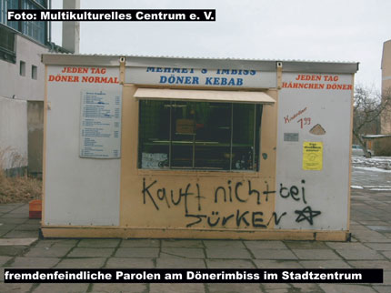 Vermutlich Neonazis besprühten einen Imbisswagen eines Döner-Verkäufers in der Nähe des Marktplatzes mit einer fremdenfeindlichen und antisemitischen Parole. Die auf dem Foto abgebildete Applikation soll vermutlich einen Davidstern symbolisieren und steht somit für eine antisemitische Motivation der Tat. Die historische Nähe zur nationalsozialistischen Kampagne "Kauft nicht beim Juden!", ist dabei unübersehbar. Indes kam es in den letzten Wochen immer wieder zu rechtsextremen und neonazistischen Propagandadelikten in der Stadt (mehr dazu hier...) und (hier...) und (hier...) .