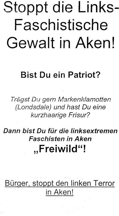 In der sachsen-anhaltinischen Kleinstadt, werden in einem Neubaugebiet mehrere hundert Flugblätter der neonazistischen "Kameradschaft Köthen" in Briefkästen verteilt. Auf den Pamphleten wird vor einer vermeintlichen "linksfaschistische Gewalt" in Aken gewarnt. Die Rechtsextremisten spielen damit offensichtlich auf die relativ starke Alternative Szene vor Ort an. Darüber hinaus werden auf der Rückseite des Flugblattes mit der Parole "Mein Großvater war Patriot! Ich bin es auch!" die Verbrechen der Deutschen Wehrmacht geleugnet. Die "Kameradschaft Köthen" gilt als eine der aktivsten Neonaziorganisationen im gesamten Bundesland.