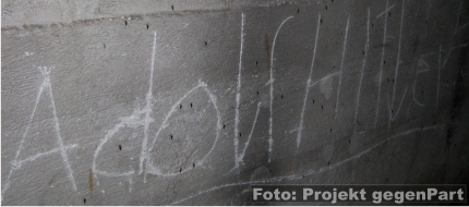 in unterirdischen Gängen finden sich noch zahlreiche Hakenkreuze und SS-Runen sowie volksverhetzende Slogans