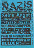 Dessau, 01. November 2003; In der Nacht vom 31. Oktober zum 01. November zieht eine Clique, bestehend aus 5-6 rechtsextremen Jugendlichen, durch die Innenstadt und entfernt gewaltsam Plakate, die auf eine antirassistische Veranstaltungsreihe hinweisen.
