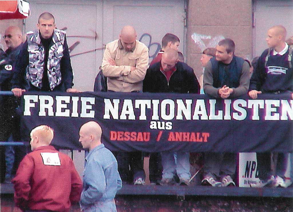 Dessau, 12. Juni 2003; AntifaschistInnen stellen im Bereich Törtener Str./Ecke Neuendorfstr. (Neubaudurchgang) neonazistische Schmierereien fest. Neben SS-Runen, einem "White Power" -Symbol und einem Hakenkreuz kann auch der Spruch "Blut muss fließen" dokumentiert werden. Dessau, 30. Mai 2003; Auf dem Gelände des ehemaligen Plattenwerks in Dessau-West stellen AntifaschistInnen neben Hakenkreuzschmierereien auch eine zum Teil bereits verbrannte USA-Flagge und den Spruch "Stop the Invasion" fest. Loburg (Anhalt Zerbst), 29. Mai 2003; Am Männertag tritt der Rechtsextremist Wildenhof die Eingangstür einer Lokalität in der Kleinstadt im Landkreis Anhalt-Zerbst ein, die auch von alternativen Jugendlichen frequentiert wird. Bitterfeld, 24. Mai 2003; Ca. 15-20 Neonazis aus dem Umfeld der Gruppierungen "Bruderschaft Bitterfeld", "Kameradschaft Köthen" und "Freie Nationalisten Dessau/Anhalt" sowie der Nazipublikation "Nationaler Beobachter Halle/Saale" reisen zur antifaschistischen Demonstration "Für den Erhalt des Multikulturellen Jugendcentrums" nach Bitterfeld an. Die Neonazis versuchen für die sogenannte "Anti-Antifa"- Arbeit Fotos und Recherchen von antifaschistischen AktivistInnen der Region zu erheben und bedrohen einige DemoteilnehmerInnen verbal. Letztlich werden die Nazis von AntifaschistInnen vertrieben und/oder von der Polizei in Gewahrsam genommen. Bitterfeld, 17. Mai 2003; Am Rande einer antifaschistischen Spontandemonstration für das linke Jugendzentrum "Festung" in Bitterfeld greift der stadtbekannte Neonazi Andreas Fechner Demonstrationsteilnehmer tätlich an. Nach einem kurzen Handgemenge kann er vertrieben werden. Dessau, 16. Mai 2003; Am 16. Mai 2003 gegen 17.40 Uhr wurde ein alternativer Jugendlicher (16) aus Dessau auf dem Friederikenplatz in Dessau-Nord durch einen Messerstich in den Rückenbereich erheblich verletzt. Dessau, 15. Mai 2003; 2 alternative Jugendliche wurden am Hauptbahnhof von 3 Neonazis zunächst angepöbelt und später mit einer Schlagteleskopstange bedroht. Die Jugendlichen machen Beamte des Bundesgrenzschutz auf die Bewaffnung der Rechten aufmerksam, diese unternahmen allerdings nichts. Loburg (Anhalt-Zerbst), 11. Mai 2003; Am darauf folgenden Tag, ebenfalls unter maßgeblicher Beteiligung von Marcel Nagora, bauen sich wiederum 30 Neonazis vor der Loburger Kneipe auf. Nur dem glücklichen Umstand, das keine alternativen Jugendlichen anwesend waren, ist es mutmaßlich zu verdanken, dass es diesmal zu keinen tätlichen Angriffen kommt. Nichts desto trotz zerstören die Neonazis die Schaufensterscheibe der Lokalität und haben vor dem Überfall, offensichtlich in Planungsabsicht, die Telefonleitung zerschnitten. Loburg (Anhalt-Zerbst), 10. Mai 2003; Gegen 03.00 Uhr stürmen mindestens 6 Neonazis unter Leitung des einschlägig vorbestraften Rechtsextremisten Marcel Nagora eine Kneipe, die auch von linken Jugendlichen frequentiert wird. Mindestens 10 weitere Neonazis stehen derweil vor der Lokalität und unternehmen nichts. Nach anfänglichen verbalen Diskriminierungen und Drohungen a la "Du bist doch schwul" und "Ihr kriegt alle eine Kugel in den Kopf!" fängt Marcel Nagora an, die noch vier  anwesenden Gäste zu schlagen und zu treten. Dabei geht nicht nur Inventar zu Bruch, sondern an den Inhaber der Gaststätte wird darüber hinaus eine eindeutig politisch motivierte Drohung ausgestoßen: "Verpiss Dich aus Loburg und beherberge keine Zecken mehr!". Einem nicht der linken Szene zuzuordnen Gast wird das Handy geraubt. Nach dem durch Nagora erteilten Befehl "Abrücken", verschwinden die  Neonazis koordiniert. Mehrere der Opfer müssen u. a. wegen Prellungen und Schnittverletzungen ambulant behandelt werden. Dessau, 20. April 2003: 25 Neonazis aus dem Umfeld der Gruppierungen "Freie (n) Nationalisten Dessau/Anhalt" und "Bruderschaft Bitterfeld" feiern im Rehsumpf in Dessau-Waldersee mit einem Lagerfeuer und einem dazugehörigen Besäufnis den "Hitlergeburtstag". Dessau, 17. April 2003; Mindestens 5 Neonazis versuchen ein Abiturfest auf dem Schulhof (Provisorium in der Schloßstr.) des Dessauer Gymnasiums Philantropinum zu stören. Nachdem ihnen der Zutritt verweigert wird, postieren sie sich "Sieg Heil"-grölend vor dem Dessauer Rathaus.    | |||||