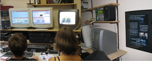 Die Medienwerkstatt:Ob Videos produzieren und schneiden, Flyer und Plakate gestalten, an der Homepage bauen oder einfach im Netz surfen, in der Medienwerkstatt verstaubt die teure Technik nicht, sondern wird rege von vielen Menschen genutzt. Als besonderes Angebot kann im Siebdruck-Workshop - vom T-Shirt bis zur Untertrikotage - alles mögliche mit eigenen Motiven bedruckt werden.