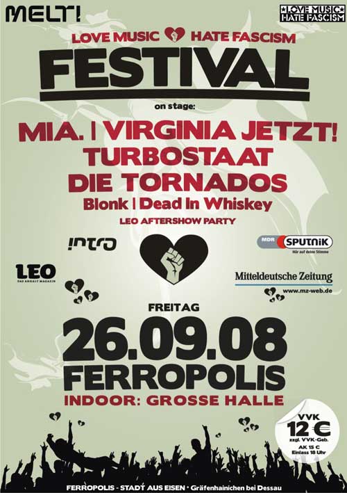 Vor der postindustriellen Kulisse eines ehemaligen Braunkohletagebaus steht der Region in musikalischer Hinsicht ein heißer Herbst bevor. Mindestens genau so anachronistisch wie das Ambiente in der Stadt aus Eisen, ist dabei der Grund für das Stelldichein bekannter Künstler und regionaler Musiker. Das Festival unter dem polarisierenden aber bekennenden Motto "Love Music - Hate Fascism"
