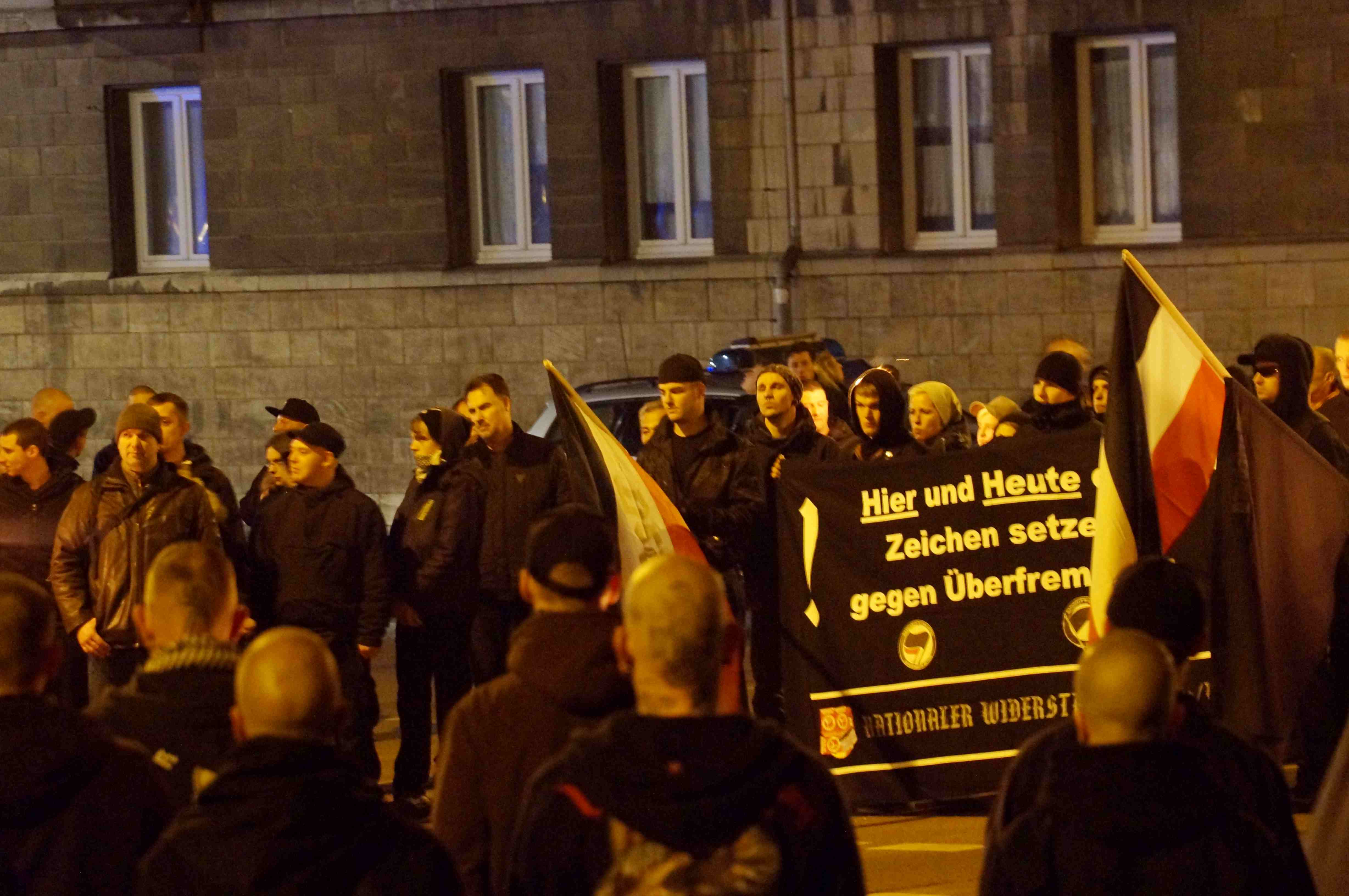 Am Abend zogen ca. 120 Neonazis aus dem militanten Kameradschaftsspektrum unter dem rassistischen Motto "Kriminelle Ausländer sofort ausweisen" durch den Dessauer Stadtteil Nord. In einer aufgeheizten und aggressiven Stimmung skandierten die Rechtsextremisten immer wieder fremdenfeindliche Parolen und fotografierten Teilnehmer des demokratischen Protestes. Als Anmelder des braunen Aufzuges fungierte der Dessauer Neonaziaktivist Alexander Weinert (mehr dazu hier...).