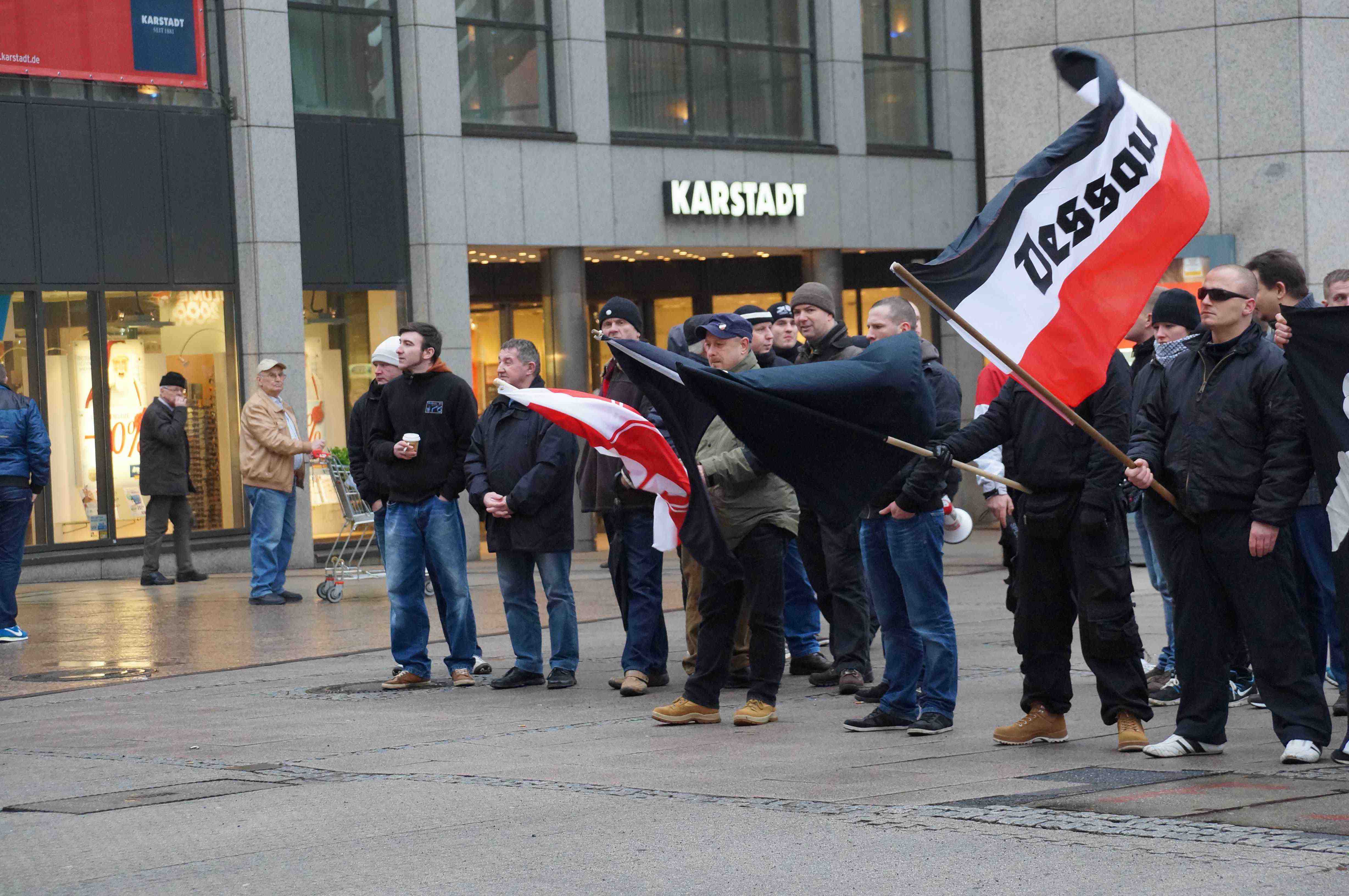 Nach der offiziellen und vorzeitigen Auflösung der rassistischen GIDA-Demonstration (mehr dazu hier...) zogen ca. 40 Personen aus dem neonazistischen Kameradschaftsspektrum und der NPD unter dem Motto "Gegen Polizeiwillkür" durch Dessau. Offensichtlich wollten sie damit ihren vorhergehenden Misserfolg ausgleichen, was aufgrund einer noch geringeren Teilnehmendenzahl und Außenwirkung jedoch nicht gelang.
