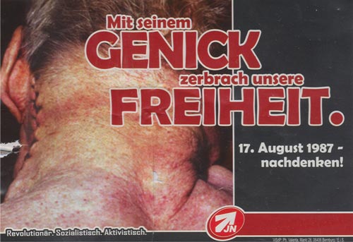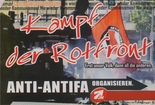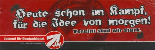 28. August 2008 / Dessau-Roßlau Im gesamten Stadtgebiet werden mehrere hundert rechtsextreme Aufkleber entdeckt und von engagierten BürgerInnen entfernt. Darüber hinaus sind zudem illegal aufgehängte Plakate der Neonaziszene im Stadtbild präsent. Offensichtlich scheinen die rechten Propagandaträger in der Nacht zuvor in einer koordinierten Aktion angebracht angebracht worden zu sein. Als Herausgeber der rechten Sticks firmiert dabei die Jugendorganisation der NPD (JN - Junge Nationaldemokraten). Die Motive glorifizieren u. a. das militante Spektrum der so genannten "Anti-Antifa", die persönliche Daten über vermeintliche oder tatsächliche politische GegnerInnen sammelt und diese Informationen dann auf rechtsextremen Internetportalen veröffentlicht. ![]() Zudem wird der Arbeiteraufstand von 1953 in der DDR instrumentralisiert und dessen geschichtlicher Kontext in einen "Nationalen Befreiungskampf" umgedeutet. ![]() Ein Stick mit dem entlarvenden Motto: "Revolutionär.Sozialistisch.Aktivistisch.", stilisiert den verurteilten Kriegsverbrecher und Hilterstellvertreter Rudolf Hess zum Helden und leugnet somit die Verbrechen des Nationalsozialismus. ![]() ![]() In der Bauhausstadt sind in den letzten Monaten immer häufiger rechtsextreme Propagandadelikte zu verzeichnen (mehr dazu hier...) und (hier...) und (hier...). Quelle: eigener Bericht |
