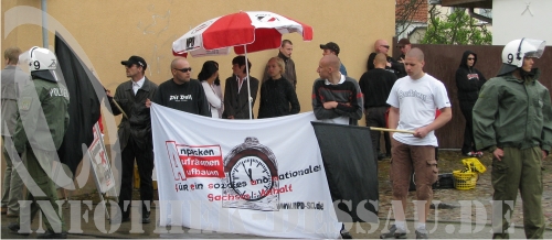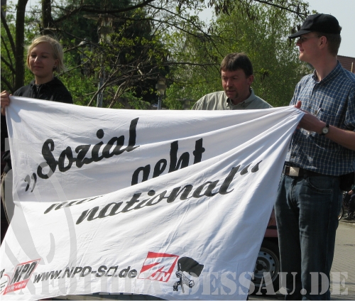 Am 03. Mai führte der NPD-Landesverband unter Anmeldung der Landesvorsitzenden Carola Holz in der Gräfenhainichener Innenstadt eine Kundgebung mit Infotisch durch. An der bedingt öffentlichkeitswirksamen Veranstaltung unter dem Motto: "Anpacken - Aufräumen - Aufbauen! Für ein soziales und nationales Sachsen-Anhalt" nahmen etwa 20 Rechtsextreme aus Anhalt-Bitterfeld, LK Wittenberg, Sangerhausen, Leipzig und Dessau-Roßlau teil.