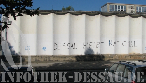 In der Nacht zum 09. September 2008 brachten mutmaßlich Neonazis mit Sprühfarbe rechtsextreme Parolen und Kennzeichen verfassungsfeindlicher Organisationen auf die Aussenwand einer Turnhalle in der Steneschen Straße auf. Über etwa 20 Meter zogen sich der Schriftzug "Dessau bleibt national, daneben waren der rechtsextreme Zahlencode "88" und ein Hakenkreuz aufgesprüht.