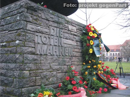 Gedenkveranstaltungen in Dessau zum HolocaustgedenktagKundgebung und Filmvorführung am 27. Januar ![]() Am 27. Januar 1945 befreiten Angehörige der Roten Armee die Überlebenden des Vernichtungslagers Auschwitz. Dieses Datum wird deshalb in zahlreichen Ländern als Tag der Erinnerung an die Ermordeten und Verfolgten des Naziregimes begangen. Zur Erinnerung an die Opfer des Nationalsozialismus und die deutschen Verbrechen laden das Dessauer Bündnis gegen Rechts und die Forschungsgruppe "Zyklon B" zu Gedenkkundgebungen und einer Filmvorführung ein. Zeitzeugengespräch anlässlich des Gedenktages für die Opfer des NationalsozialismusÉva Pusztai Ehrengast zu ökumenischer Gedenkveranstaltung ![]() Anlässlich des Gedenktages für die Opfer des Nationalsozialismus (27. Januar – Jahrestag der Befreiung des Vernichtungslagers Auschwitz) lädt die Konrad Adenauer Stiftung zu einer ökumenischen Gedenkveranstaltung in die Kath. Kirche „Heilige Familie“ sowie ins Gemeindezentrum Bitterfeld-Wolfen ein. Als Ehrengast wird die Zeitzeugin Éva Pusztai aus Ungarn zugegen sein. weiterlesen... Erklärung zum Polizeieinsatz am Rande der Oury Jalloh-GedenkdemonstrationBeratungsprojekte gegen Rechtsextremismus zeigen sich bestürzt ob der Verletzungen des Aktivisten Mouctar Bah am Rande der Demonstration „Break the Silence“ // lückenlose, transparente und zeitnahe Aufklärung der Umstände des Polizeieinsatzes gefordert // Ereignisse haben beginnenden Dialog in Dessau-Roßlau schwer geschadet ![]() Die Beratungsstelle für Opfer rechter Gewalt (OBS Dessau) und das Mobilen Beratungsteam gegen Rechtsextremismus (Projekt gegenPart) haben mit tiefer Bestürzung und großem Bedauern Medienberichte zur Kenntnis genommen, wonach der bekannte Menschenrechtsaktivist Mouctar Bah nach einem Polizeieinsatz am Rande der Oury Jalloh-Gedenkdemonstration „Break the Silence“ am 07. Januar 2012 so schwer verletzt wurde, dass er im Krankenhaus behandelt werden muss. Die OBS Dessau und das Projekt gegenPart haben im Rahmen der Dessauer Prozessbeobachtergruppe die 1. Hauptverhandlung um den Feuertod Oury Jallohs am hiesigen Landgericht dokumentarisch begleitet (mehr dazu hier...).