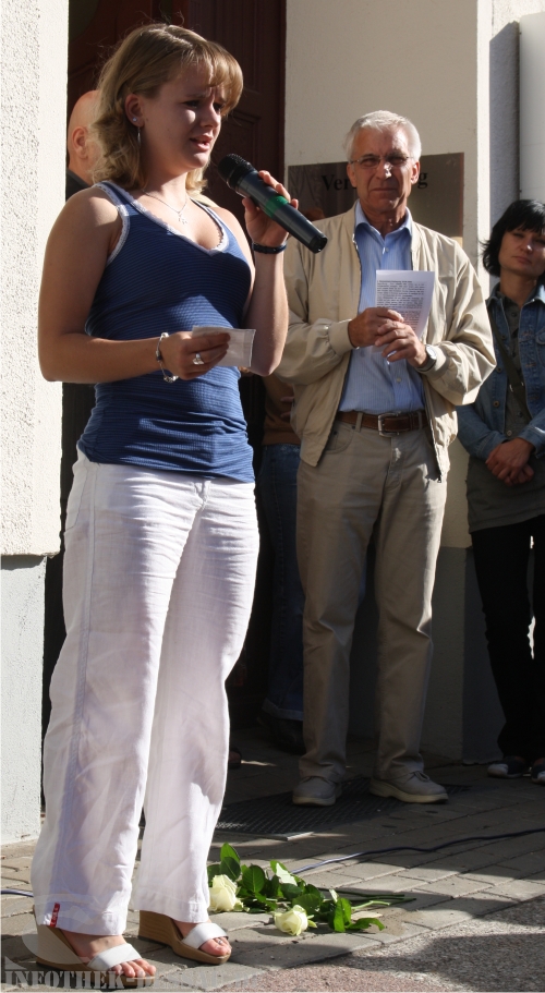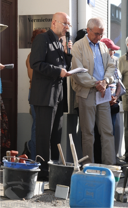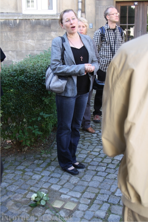 Donath erinnert daran, dass in der Nacht zum 31. Juli 2009 zwei Stolpersteine in der Kurzen Gasse von mutmaßlichen Rechtsextremen gestohlen worden sind und fragt in die Runde der Gäste: „Wollen diese Täter, dass die Opfer des NS-Regimes auf diese Weise erneut geschändet und gequält werden?“ Die Aufmerksamkeit von allen sei zukünftig gefordert, um solche schändlichen Taten zu verhindern. Die entwendeten Gedenksteine sollen dann auch bald erneuert werden, gibt er bekannt. „Möge jeder Stolperstein ein Anstoß des Guten sein“, schließt der Pfarrer im Ruhestand seine Einführung schließlich ab.