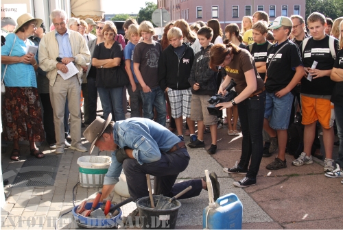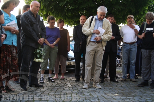 Im Rahmen des vom Lokalen Aktionsplan für Demokratie und Toleranz geförderten Projektes „Gedenkkultur Dessau-Roßlau“ (mehr dazu hier…) sind am 24. August 2009 zwölf weitere Stolpersteine verlegt worden. Mehr als einhundert Menschen kamen an der ersten Station in der Rabestraße zusammen, um den ermordeten ehemaligen Dessauerinnen und Dessauern zu gedenken. Die Stolpersteine zeigen auf einer Messingplatte die Namen und Lebensdaten sowie Umstände des Todes – sofern diese Daten bekannt sind – von Menschen, die während des Nationalsozialismus deportiert und ermordet worden sind. Die Orte der Gedenksteine markieren dabei den letzten selbst gewählten Wohnort jener Opfer des NS-Terrors. „Jeder Stolperstein ist ein Stein des Anstoßes“, bringt Günther Donath, Vertreter der „Werkstatt Gedenkkultur“, in seiner Moderation zum Ausdruck und fährt fort: „Unseren Verstand wollen sie anstoßen und unser Gewissen“.