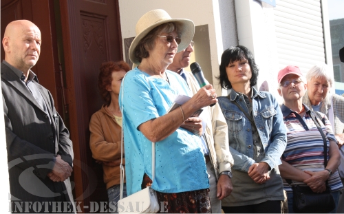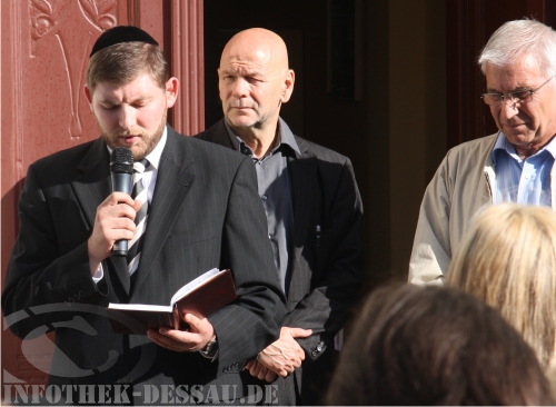 Günther Donath erklärt sich vor dem Wohnhaus Moses Mendelssohns in der Askanischen Straße, dass nur einen Steinwurf vom Standort der einstigen Synagoge entfernt ist, mit der jüdischen Gemeinde der Stadt solidarisch. Die sei in der jüngsten Vergangenheit immer wieder neonazistische Bedrohungen und Schmierereien ausgesetzt gewesen.