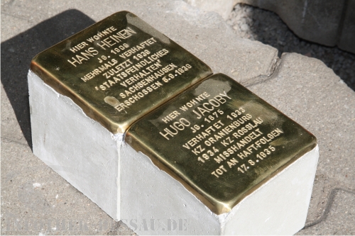 Vor der Franzstraße 162 werden von Günther Demnig zwei Stolpersteine für Hugo Jacobi und Hans Heinen in den Gehweg eingelassen. Hugo Jacobi, der aus einer jüdischen Familie stammte, unterhielt bis zu seiner frühen Verhaftung 1933 ein Geschäft für Buchbinder- und Schreibmaschinenarbeiten. Nachdem er in der Revolutionszeit 1918 dem Dessauer Soldatenrat angehörte, wurde er 1920 Vorsitzender der KPD-Ortsgruppe und leitete später die Roten Hilfe. Im Juni 1933 kam er vom Konzentrationslager Roßlau schließlich nach Oranienburg und wurde grausam gefoltert. An den Folgen dieser Misshandlungen verstarb Hugo Jacobi 1935. Er ist auf dem israelitischen Friedhof der Stadt beerdigt. "Als die meisten Dessauer 1932/33 erst Nazis wurden und deren Taten gebilligt haben, saß Jacobi schon im Konzentrationslager", erinnert der Lokalhistoriker Werner Grossert an eins der ersten Opfer des NS-Terrors.