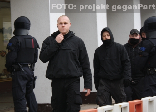 Unerwartet kam dann kurz nach 15.00 Uhr plötzlich Bewegung in die Szenerie, weil sich die Einsatzleitung für eine eher ungewöhnliche polizeitaktische Maßnahme entschied, die im Nachgang bei Landespolitiker_innen und erfahrenen Demonstrationsbeobachter_innen zum Teil scharfe Kritik auslöste. Die Polizei hatte sich entschieden, die Rechtsextremisten über den Fußweg in Höhe Magnet-Kaufhaus an den Blockaden vorbei zuleiten. Dabei mussten die Neonazis nicht nur ihren Lautsprecherwagen zurücklassen, da das Fahrzeug nicht hindurch passte, durch eine weitere Blockade auf dem Bürgersteig wurde zudem der Aufzug in zwei Teile geteilt. Ohne adäquate Polizeibegleitung, so der Vorwurf, liefen die Teilnehmer des Neonazi-Aufmarsches anschließend direkt durch die Gegendemonstration. Alexander Weinert, Dessauer Neonaziaktivist und Anmelder des rechtsextremen Aufmarsches, auf dem Bürgersteig in der Kavalierstraße (mehr dazu hier...). Nach dieser doch recht heiklen Situation die mit viel Glück glimpflich verlief, setzte der braune Aufzug seinen kilometerlangen Marsch in Dessaus Süden fort. Am Zwischenkundgebungsort am Friedhof III angekommen, wurden die üblichen Fackeln angezündet und der Kameradschaftsaktivist Dieter Riefling (Hildesheim) hielt eine kurze Rede, die nahezu jede krude These des Neonazi-Repertoire beinhaltete, die in der kurzen Zeit unterzubringen war. Riefling fabulierte vom wehrlosen und grundlos angegriffenen deutschen Volk, von der heldenhaften Wehrmacht, den Mordabsichten der Alliierten und erklärte sich und die anderen Aufmarschteilnehmer zur neuen deutschen Elite. Am Bahnhof Süd wurde die Demonstration schließlich beendet.