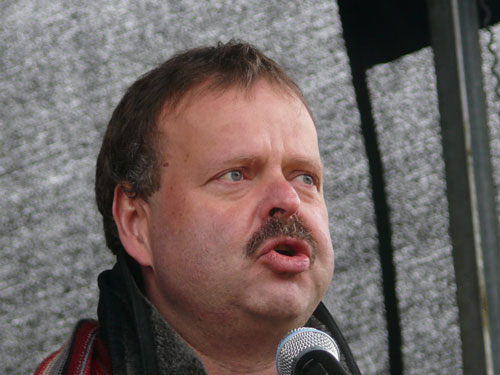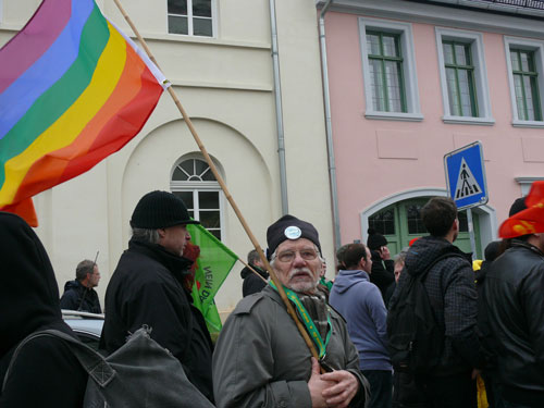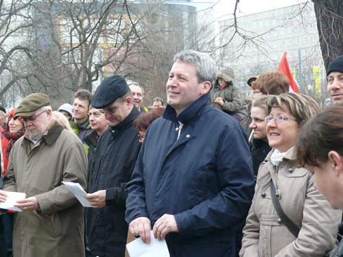 An diesen Gedanken knüpft Holger Hövelmann nahtlos an. Mit Blick auf die Januarereignisse in der Stadt sagt der SPD-Landtagsabgeordnete: „ Wer sich anschaut was hier in den letzten Monaten passiert ist, der muss aufwachen.“ Holger Hövelmann gibt unumwunden zu, dass er sich zum demokratischen Protest schon ein paar Menschen mehr auf den Straßen und Plätzen gewünscht hätte. Mit Blick auf die Neonazis, die sich keine hundert Meter weiter sammeln und inzwischen auf 70 Personen angewachsen sind, gibt er sich jedoch quantitativ versöhnlich und bekommt dafür aufmunternden Applaus: „Wir sind aber immer noch deutlich mehr, als dieser versprengte Haufen dort“.