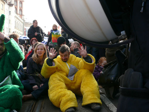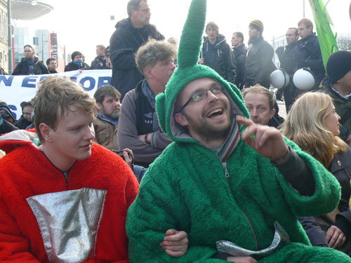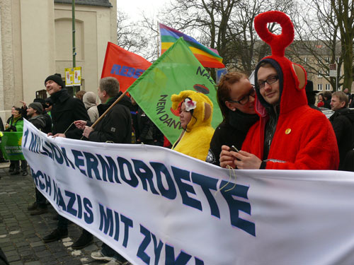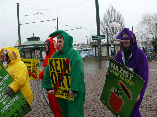 Mit solchen Aufforderungen müssen die Anti-Nazi-Teletubbies, die in der Stadt inzwischen zum festen Bestandteil der Protestkultur geworden sind, nicht erst missioniert werden. Kurz bevor sich der rechtsextreme Aufzug mit handgezählten 128 Teilnehmern vom Busbahnhof aus in Bewegung setzt, laden Tinky-Winky, Laa-Laa und Co. mit ihrem infantilen Charme zum kreativen Stadtrundgang ein.