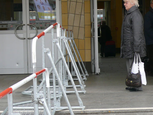 Absperrgitter am Hauptbahnhof Die zentrale Protestumgebung startet pünktlich um 10.00 Uhr am Dessauer Hauptbahnhof. Neonazis sind da noch nicht zu sehen, doch sehr wohl ein Fahnenmeer, zahlreiche Infostände und eine Bühne, von der in den kommenden zwei Stunden ein Schüttelmix mit hohem qualitativen Anspruch für die 400 Demonstrant_innen geboten wird. Und dieses Arrangement aus politischen Statements, einer Mit-Singaktion, satirischen Anflügen und Rezitationen war tatsächlich bunt. Neben schrillen und eher langatmigen Momenten, gab es auch Gänsehaut-Feeling und lustig-rhythmische Sequenzen. Aber schön der Reihe nach.
