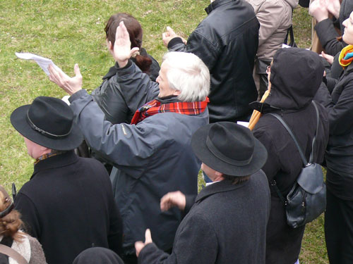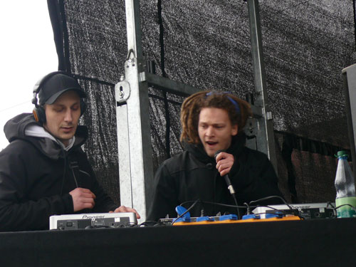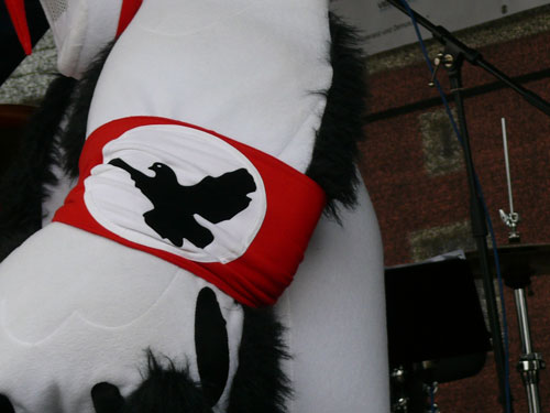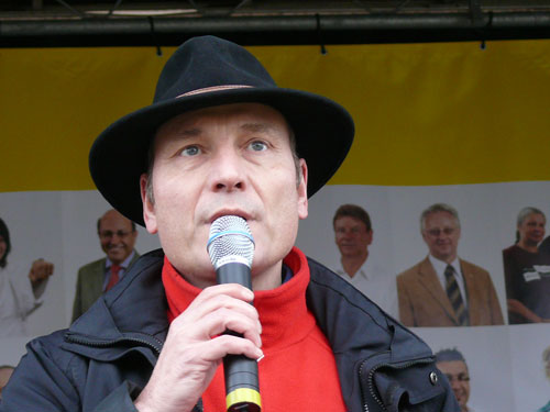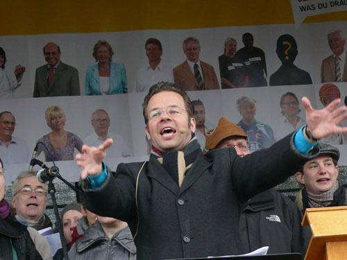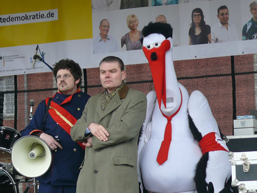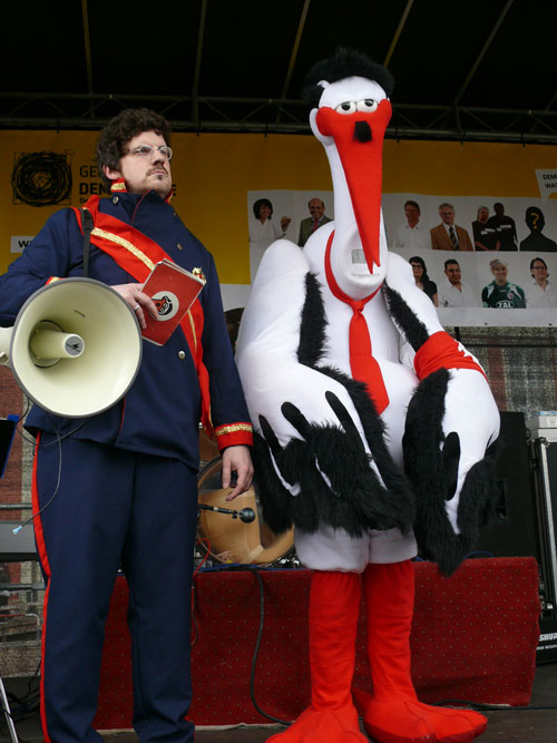 Schon kurz vor dem Statement des Innenministers, hat sich indes ein langbeiniger Geselle mit einem überdimensionierten Schnabel auf die Bühne gepirscht. Der Kollege Adebar hört dabei in Anlehnung an eine bei Rechtsextremisten beliebten Modemarke auf den klangvollen Namen „Storch Heinar“. Die Satiretruppe um das Jusos-Projekt „Endstation rechts“ soll wohl mehr sein, als eine kurzweilige Pausenfüllung. Programmatische Ansagen a la „Wir werden den Nazis zeigen, wo der Frosch die Locken hat“, sorgen dann tatsächlich für einiges Gelächter im Biotop des Vorbühnenbereiches, inklusive des dramaturgisch passenden Regenschauers.