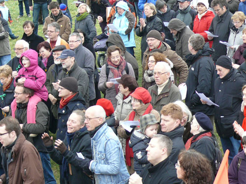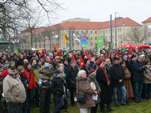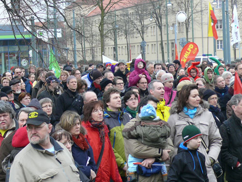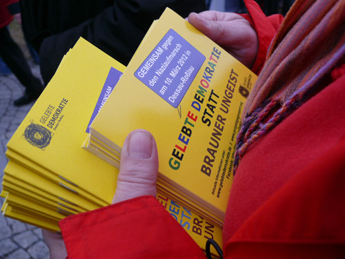 „Das Dessau zerstört wurde, haben wir den Nazis zu verdanken!“ Mehrere Hundert Menschen stehen bunt und vielfältig für Demokratie und Weltoffenheit ein/ friedliche Blockaden von Nazigegnern setzen deutliche Zeichen gegen rechtsextremen Aufmarsch am 10. März 2012 in Dessau-Roßlau