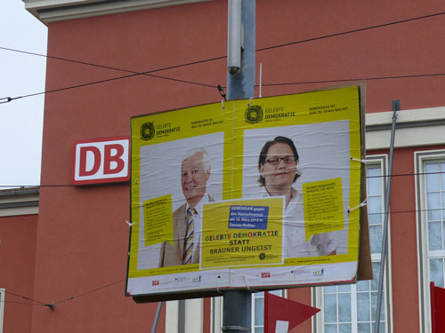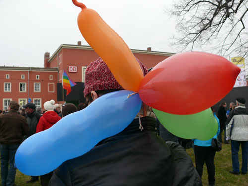 Wehende Protest-Transparente, Absperrgitter, eine Bühne und Polizeifahrzeuge im Gleisbett der Straßenbahn kündigen am Dessauer Hauptbahnhof jenes Szenario an, dass sich seit Jahren immer im März wiederholt. Mehrere Hundert Menschen sind an diesem Tag dem Aufruf des Netzwerkes GELEBTE DEMOKRATIE (mehr dazu hier…) gefolgt, um singend, pfeifend, tanzend und trompetend im gesamten Stadtgebiet mit ihrem Gesicht eine bunte und kreative Manifestation auf die Straße zu tragen. Der Grund für dieses Frühlingserwachen der etwas anderen Art: Ein so genannter Trauermarsch von Neonazis aus dem Kameradschaftsspektrum. Die rechtsextreme Szene instrumentalisiert alljährlich (mehr dazu hier…) und (hier…) die Bombardierung der Stadt am 07. März 1945 durch alliierte Truppen dazu, um die Verbrechen des nationalsozialistischen Deutschlands zu verharmlosen und damit die Erinnerung an die NS-Opfer zu verhöhnen. Den ewiggestrigen Geschichtsverfälschern blies auch diesmal ein lautstarker Sturm der Empörung und Entrüstung um die Ohren, friedliche Sitzblockaden inklusive.